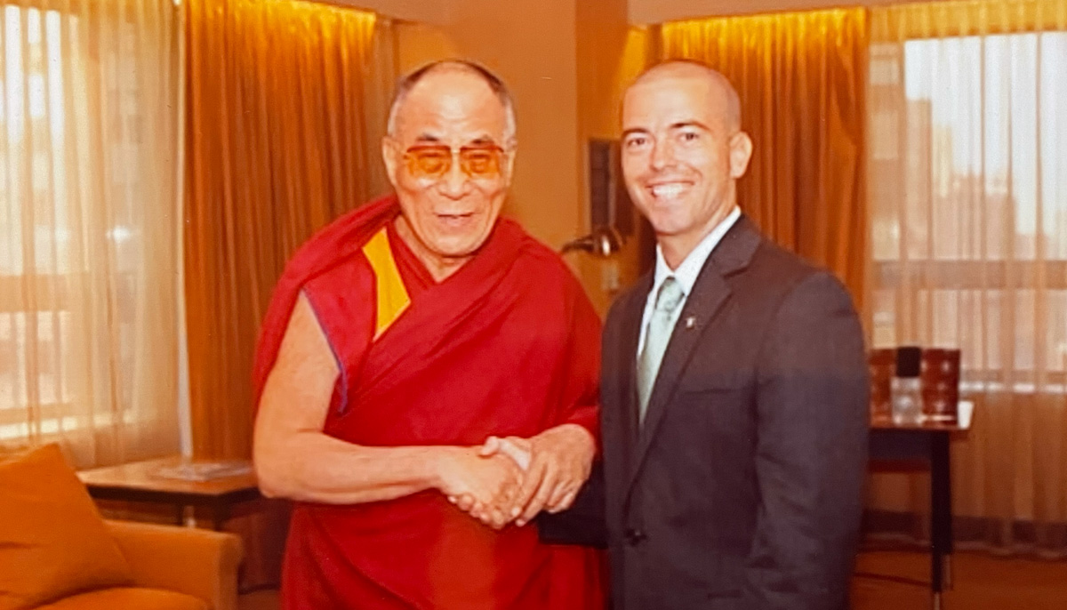 Beaming inside, as he always did when fortunate enough to be on His Holiness’s private detail, Detective Jeff Thompson, PhD, let Richard Gere squeeze past followed by Nicholas Vreeland, Director of The Tibet Center in NYC. Recognizing Jeff, Vreeland stopped Gere for a moment.