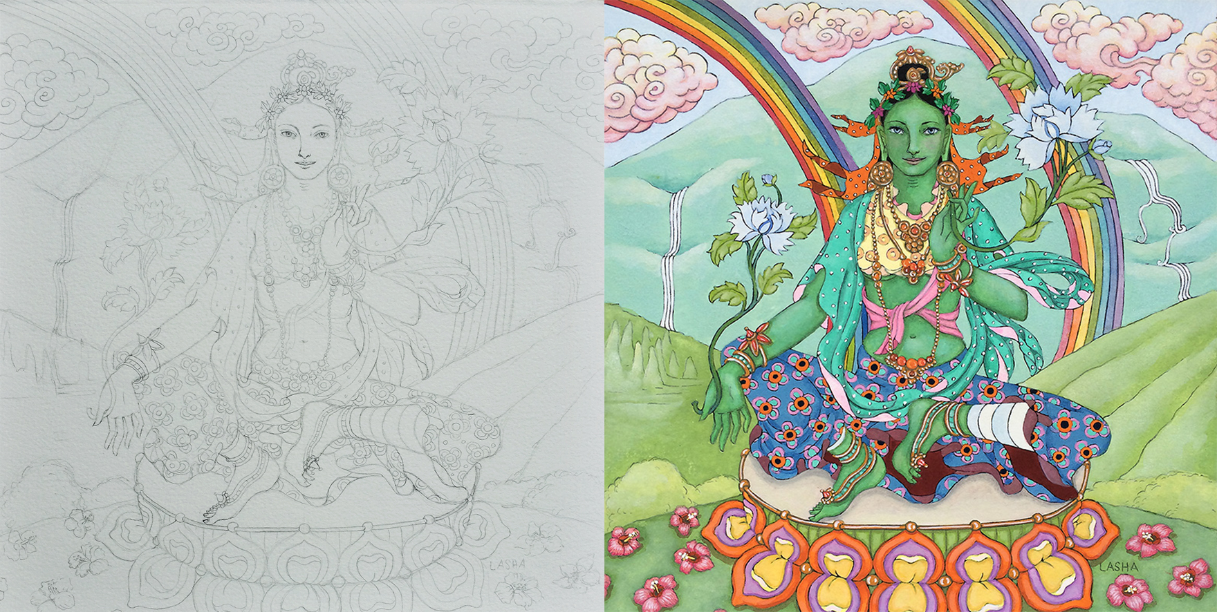 Lasha Mutual: I love the idea that the physical act of painting could be blended with mantra recitation to imbue an image with that extra layer of intention, but at this point, my inability to focus on these two things simultaneously doesn’t create a feeling of mental ease or flow. I’ve experimented with reciting the 21 Praises to Tara silently while working on a painting of this same theme, but I wasn’t able to fluidly make those instantaneous artistic decisions necessary while painting and still remember each stanza in the prayer. It was really humbling to realize how hard this is! It feels like a lovely compromise to listen to dharma talks while I paint, and then focus on mantra recitation during sitting practice.