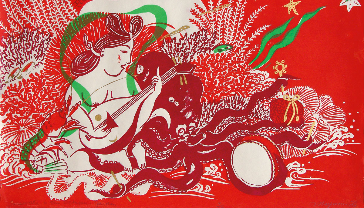 In her large, colorful silk screen prints, she had her own fresh take on Edo-period ukiyo-e. She was dreaming up scenes of women—goddesses—who were at one with nature. They were, as she describes it in Sarasvati’s Gift, “diving into the ocean, frolicking through flower gardens, soaring in the sky.” Oda began receiving invitations from galleries and museums to show her work; she became a professional artist.