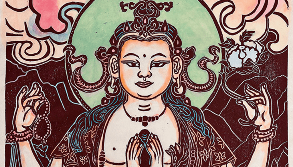 The famous Tibetan mantra OM MANI PADME HUM, meaning “OM the Jewel in the Lotus HUM,” invokes Chenrezig (Avalokiteshvara), the bodhisattva of compassion. In this case, the lotus represents wisdom and the jewel symbolizes skillful means.