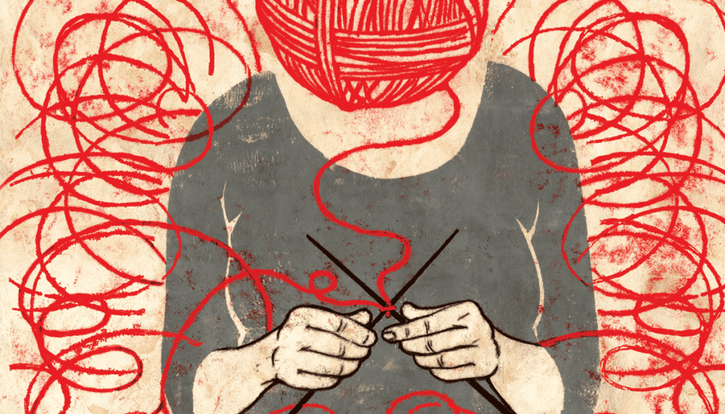 In the dharma of knitting, there is no past or present or future, says Jennifer Urban-Brown. Without holding on to the promise of the finished object, loop yarn, pull through, breathe in, breathe out.