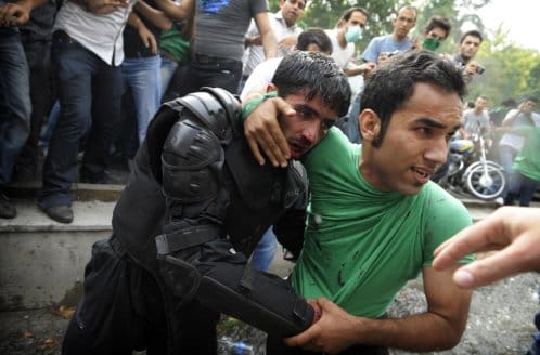 Steve Silberman reflects on a picture from the Iran elections of a protester helping a wounded riot policeman out of the crowd to safety: