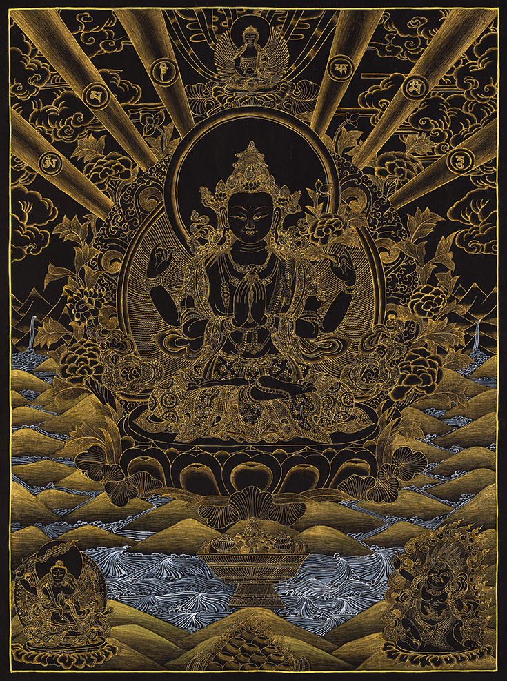 The bodhisattva Chenrezig is the embodiment of primordial compassion that unceasingly manifests to hold and alleviate suffering. This boundless compassion and altruistic intention are innate to each of us, but are veiled to us by our habitual ways of perceiving. Chenrezig shows us our true nature—our unveiled, genuine heart.