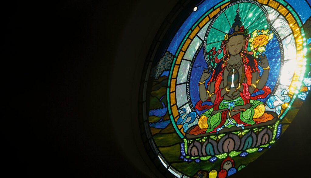 As we engage in Chenrezig practice, we come to better understand the essential nature of form and embodiment. We do this by letting go of our habitual ways of experiencing ourselves and others and assuming the awakened nature of Chenrezig. We view ourselves and all beings as Chenrezig and our environment to be an exquisite pure land where all that we encounter brings joy and bliss. We come to learn that all form, including ourselves, is the radiance of awakened awareness. Being awakened awareness, all form is sacred, imbued with meaning, and it’s not defined or limited by the quagmire of conditioned existence with its manufactured divisions and hierarchies. Form manifests in countless unique variations, much like radiant light refracted through the multifaceted surfaces of a crystal unveils different hues of the same luminous truth. Chenrezig’s embodiment, the very essence of benevolent intent and action, mirrors our own and all beings’ potential.