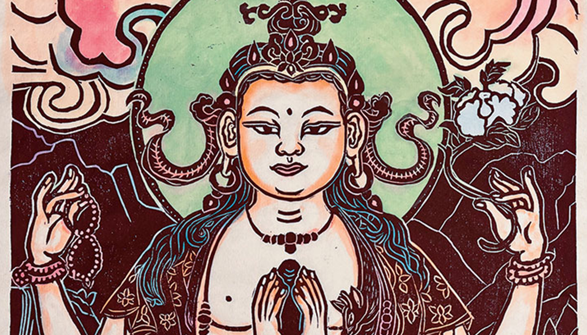 Chenrezig plays a central role Vajrayana Buddhism, and in Tibet his mantra, Om Mani Padme Hung, is a continuous refrain. In various iterations, Chenrezig appears with distinct forms, colors, demeanors, ornaments, implements, postures, and mudras. Some of the most well-known forms include four-armed Chenrezig and thousand-armed Chenrezig. The iconography and attributes of his different forms illuminate various aspects of his compassion and the variety of his skillful means. Regardless of the form he assumes, he’s in essence the union of wisdom and compassion, and he perfectly embodies the bodhisattva commitment.