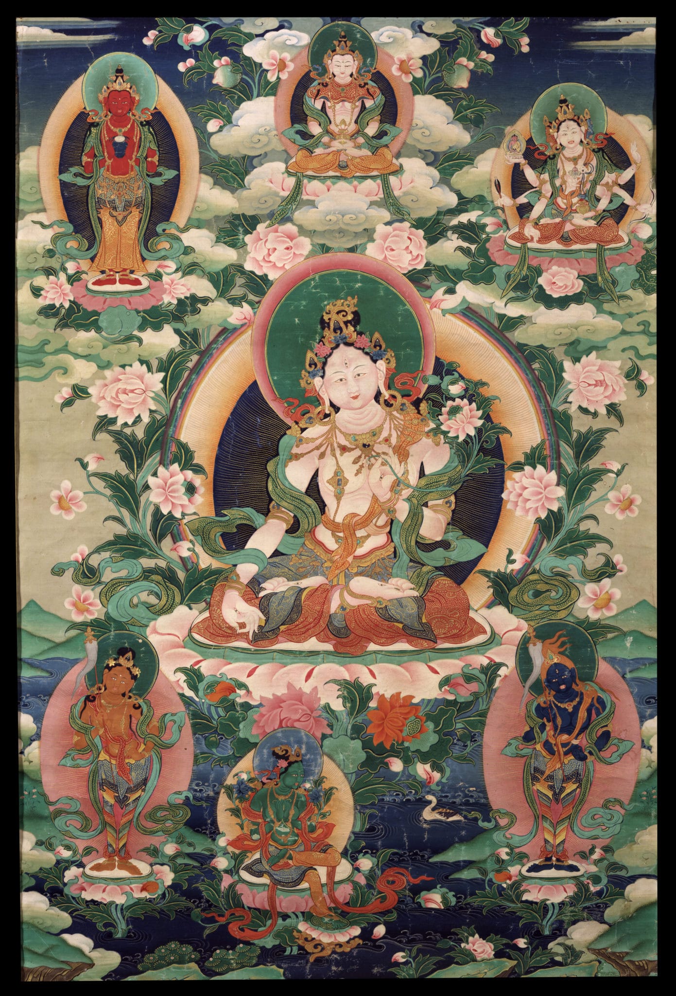 So where does Tara come from? What is she? How does she function? There are a number of stories by different masters, but the most reliable and commonly accepted source is The Origin of the Tara Tantra, written by Taranatha in the early seventeenth century. According to this text, Avalokiteshvara, the bodhisattva of compassion, was very busy helping beings. But at one point, he was nearly overwhelmed by the magnitude of the task and the extent of the suffering that beings were experiencing. It is said that he became concerned to the point of shedding tears, saying, “I need help.” He took a teardrop and flung it away, and suddenly Tara appeared and said, “I am here to help you.”