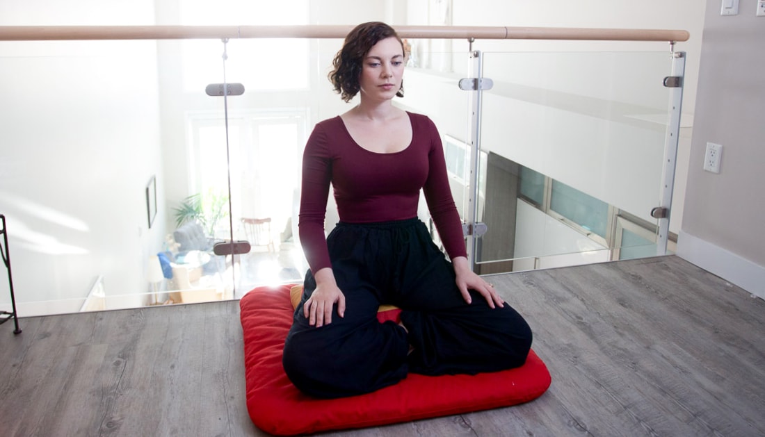 1. Toma asiento. Siéntate con las piernas cruzadas sobre un cojín de meditación o siéntate en una silla con el respaldo recto con tus pies planos sobre el piso, sin recargarte en el respaldo de la silla.
