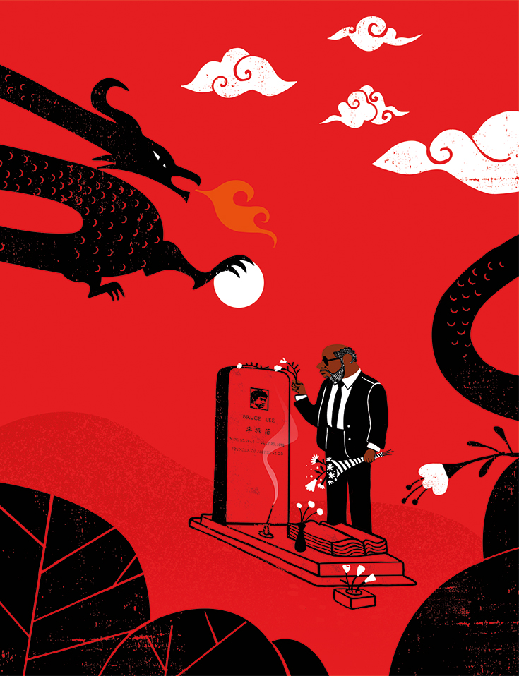 On the headstone, there is a black-and-white photo of Bruce, forever thirty-two years old. It was he who revolutionized fight scenes in American movies and shattered stereotypes by projecting the image of an Asian man who was unbeatable, handsome, young, and sexy. His name appears in English and Chinese, and beneath that are the words “Founder of Jeet Kune Do.” At the foot of his grave there’s an open book made of stone, which is as black as anthracite or onyx. On its left page is a yin and yang symbol.