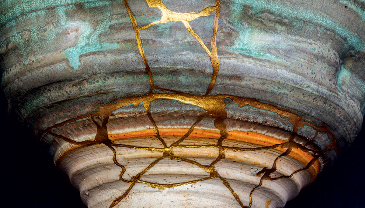 In Japan, in a practice dating back to the fifteenth century, highly skilled craftspeople developed the craft of pottery repair into a fine art, called kintsugi. The process basically consists of repairing broken pottery with lacquer that’s dusted and burnished with powdered gold. Rather than trying to hide the flaws, the pieces of bowls or pots or plates are lovingly reassembled and the lines where they were broken become highlighted with gold, marking them as precious objects honored and even prized for their imperfections.