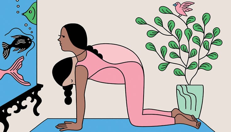 Rock back and forth, and side to side, until your weight feels balanced. Starting with your tailbone, begin to ripple through your spine until you have curled into Cow pose. Reverse this action, dropping your tailbone under and rounding up into a Cat arch. Repeat this six times. When your mind strays, bring it back by noticing where your back feels supple, tense, spacious, or unconscious.
