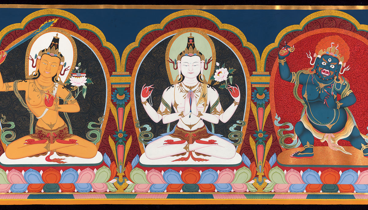 The primordial bodhisattvas Manjushri (wisdom), Avalokiteshvara (love), and Vajrapani (power). The Three Protectors of Tibet by Tsherin Sherpa / Acquisition made possible by the Tibetan Study Group / Asian Art Museum of San Francisco