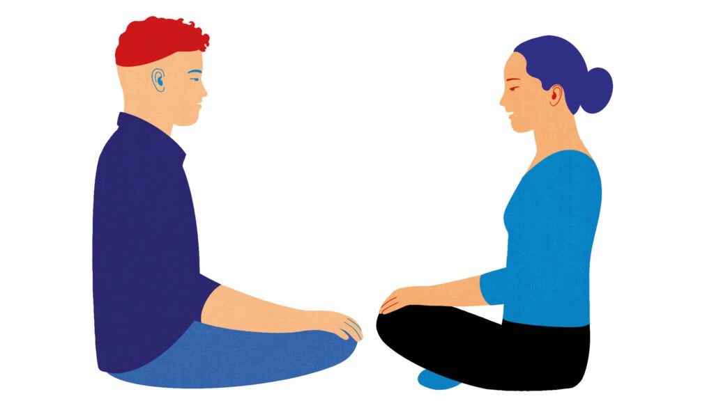 Practice sitting facing each other, maintaining soft eye contact, and taking turns speaking and listening. The speaker shares openly, while the listener remains fully present, breathing slowly and receiving without interruption.