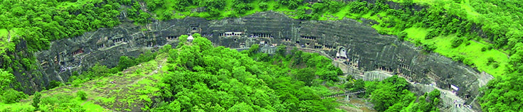The Ajanta Caves, located in the Indian state of Maharashtra, were not formed by nature. Gouged out of the cliff face by hand, the thirty-one caves in the complex are arranged in a pleasingly uniform curved line, their mouths embellished with pillars and sculptures of buddhas and elephants. Since this is the rainy season, the floor of the ravine and the top of the cliff are lush with greenery, and these two emerald borders serve to highlight the carved brown stone.