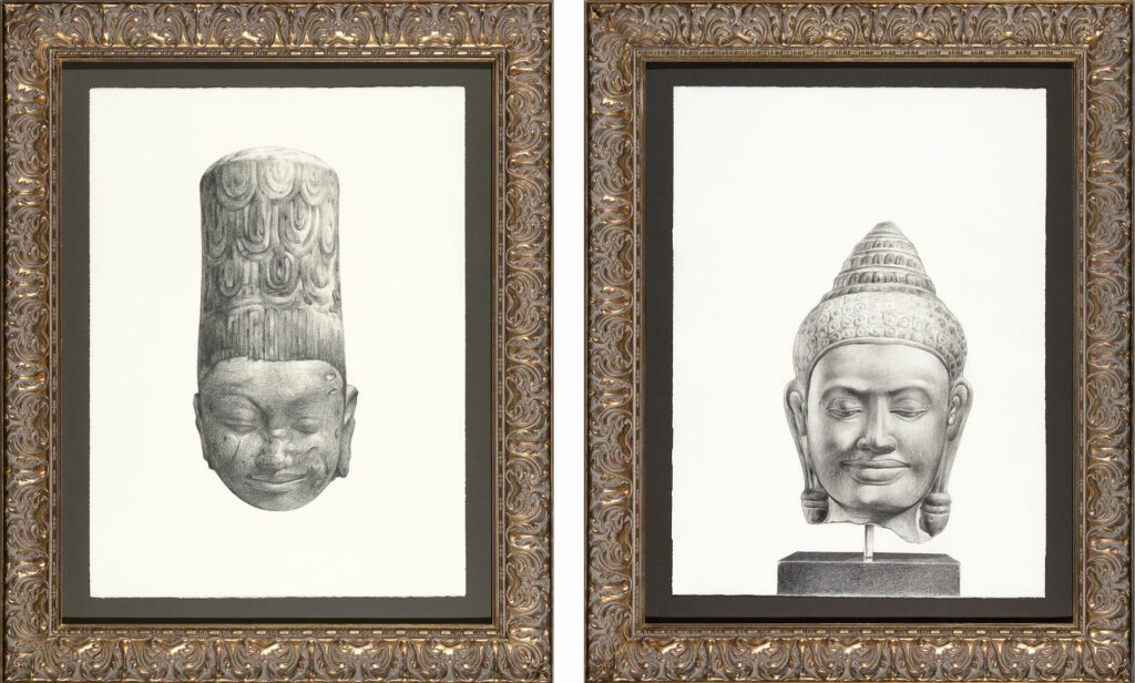 Indeed, Buddha heads have become common decorations in gardens and restaurants to evoke peace, mindfulness, and wisdom. For Huynh, however, those Buddha heads are symbols of religious violence and colonial theft. “There are thousands of Buddha heads and fragments in museums in America, Europe, and Australia that need to be returned to Cambodia,” she says. “When my boys and I were visiting these ancient temples and cemeteries, we saw a lot of headless Buddhas. That was very heartbreaking. For us, these statues are not objects—they’re manifestations of Buddhism, they’re divine, they’re vessels for the divine and for our ancestors.”