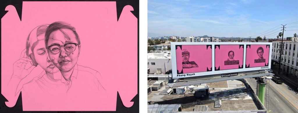 Portraits of refugees are drawn onto the pink boxes, unpacking “the complexities of immigration, displacement, and cultural assimilation with Southeast Asian communities.”