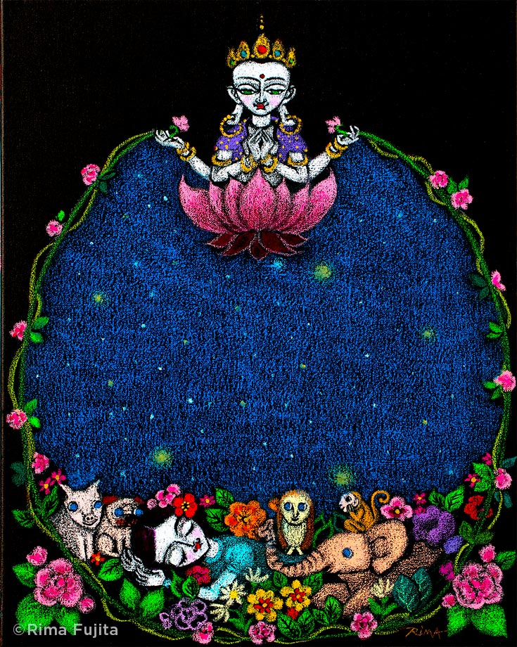 “I feel fortunate to have encountered Buddhism, which wasn’t something that came to me from my parents,” she tells me. “My Tibetan Buddhist practice changed my life, not just the way I live, but also in what I use my art for, why I create it.” Compassion became Fujita’s main focus.