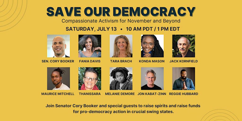 On July 13, 2024, a number of Buddhist teachers will join U.S. Senator Cory Booker of New Jersey in a free virtual event to raise support for pro-democratic action in the upcoming U.S. presidential election.
