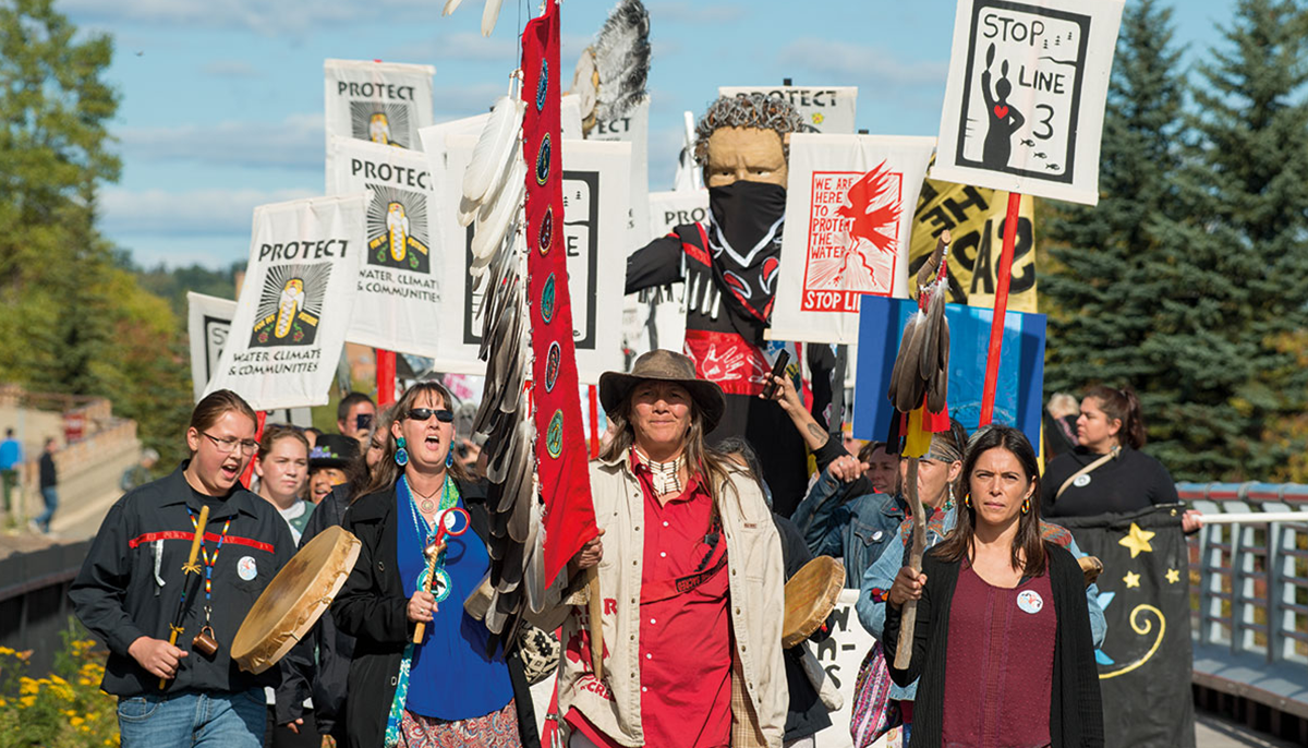 Resplendent in a brightly colored long skirt, she was flanked by her daughters and granddaughters. Behind them lay a glittering lake, towering trees, and representatives of a half dozen religious traditions bearing signs that read “Stop Line 3.”