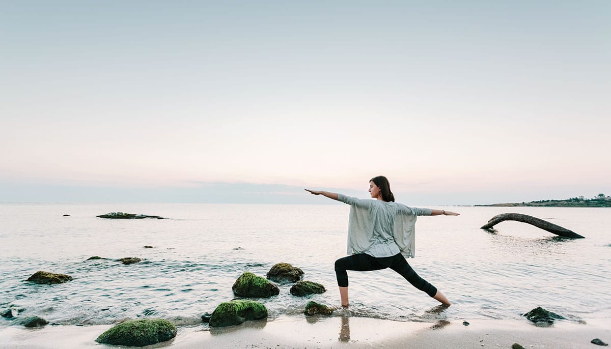 Stand or sit upright with your feet firmly planted. Place one hand on your chest and one at the base of your spine. Inhale through your nose for four counts, exhale through your nose for four counts, and repeat. Feel the movement of your breath beneath your hands. Let your mind ride on the breath, like a raft on the ocean. You can also place hands on heart, belly, forehead, or thighs.