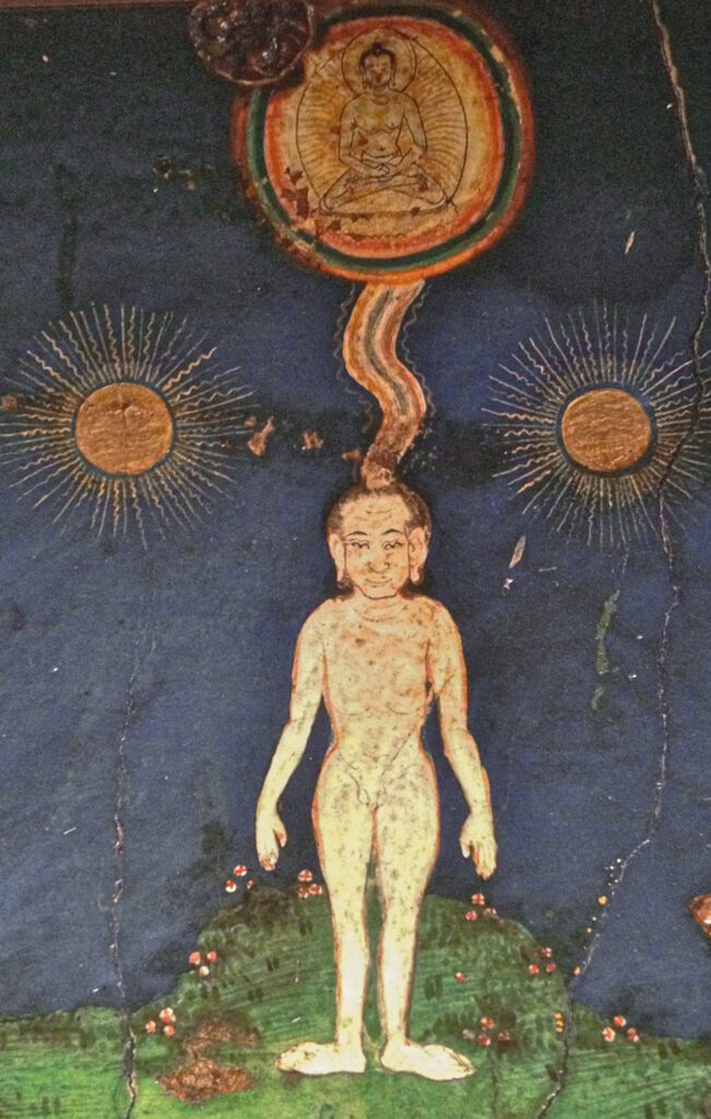 The buddha-form suggested in the phowa as taught in the Six Dharmas of Naropa is known as “Transference to the Heart of the Guru” (visualized in the form of Chakrasamvara in sexual union with Vajrayogini). Some alternative traditions suggest Amitabha Buddha; others suggest Chenrezig, the Buddha of Compassion. My personal favorite is as taught in the Six Dharmas of the Indian female mystic Niguma, where White Yogini is used as the yidam, or meditation deity. (It is said that if one is of a slightly aggressive nature one should use a white dakini, and if of a more passionate nature, to utilize a red dakini.) Here, the central channel is established, running from the base of the pelvic floor to the top of the brain, with the top of the skull open like a skylight window. One visualizes the essence of one’s sense of self as resting in the navel chakra, and the white naked dakini above one’s head, with her heels behind her ears and her birth passage pressed against one’s brahma aperture. This is a female tantra method, and basically appeals to the instinct to return to the womb of the mother in times of fear and anxiety. One imagines oneself at the base of the central channel, and looks up. One then engages the tummo practice, causing the energy ball of mind and prana to be projected up the channel to the open mouth of the brahma aperture. This lays the foundations of the path for conscious dying when the occasion occurs. Again, the practice is continued until a blister forms at the crown as a sign of success.