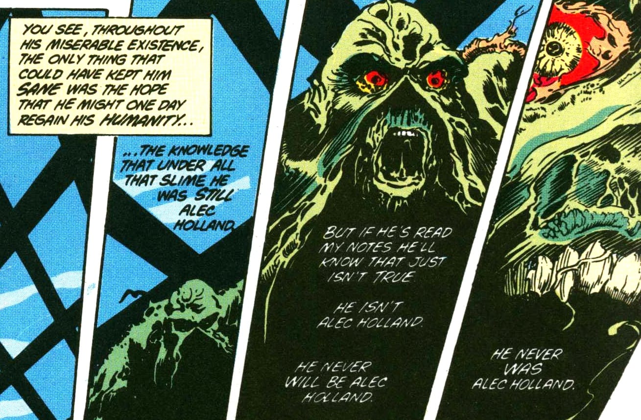 Swamp Thing’s creators depicted the character as a transformed version of Alec Holland. In Moore’s version of events, though, Holland died in the original lab explosion – the Swamp Thing formed only after the chemically-enhanced plants surrounding his body absorbed his memories and, believing themselves to be Holland, took the shape of a man. The Swamp Thing’s sense of itself as a permanent entity called “Alec Holland” is therefore an illusion — he is not the soul of a man trapped in a vegetable body, but rather an aggregate consciousness with no real connection to the dead scientist.