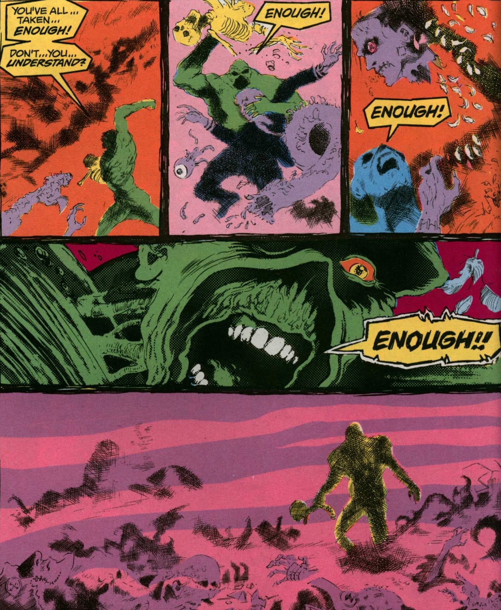 According to Trungpa, “In the third stage, ego develops three strategies or impulses with which to relate to its projections: indifference, passion, and aggression,” the last of which he characterizes as “the feeling that you cannot survive and therefore must ward off anything that threatens your property or food.” Traumatized by the knowledge of his true nature, the Swamp Thing falls into a vivid hallucination, in which his struggle to come to grips with his identity is dramatized as an ongoing battle with demonic entities who wish to steal his “humanity.” This humanity, his false notion of self, takes the shape of a symbolic skeleton, grasped tightly to his chest. When his pursuers demand his humanity, he flies into a rage, “warding off” the attackers. He is “relating” to the illusory projection of his humanity as we all do — by alternately trying to maintain a hold on it and attacking anything that threatens it.