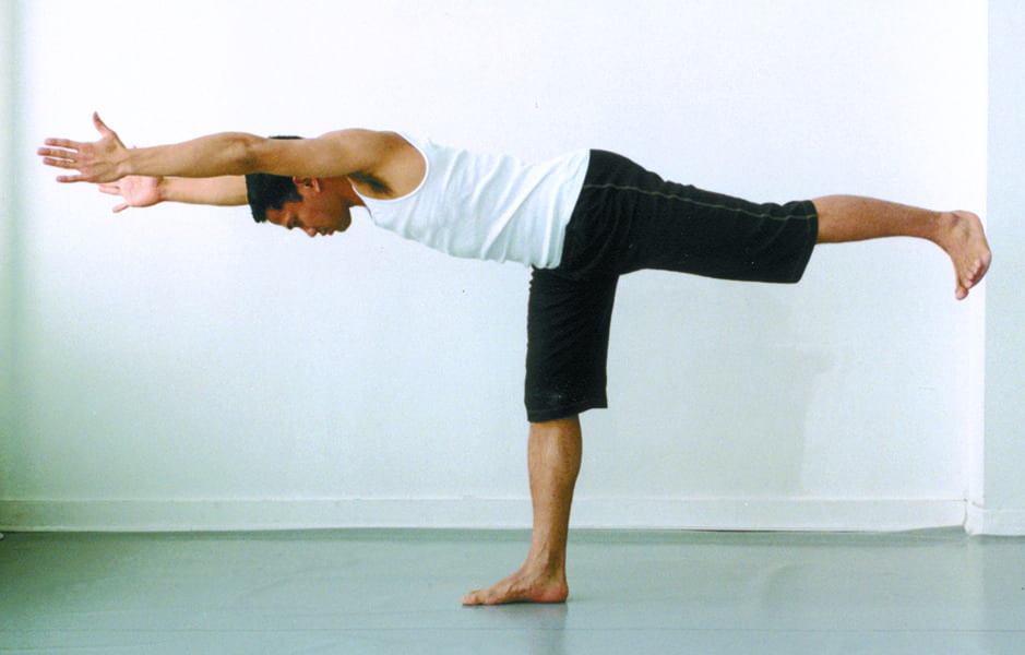 2. Warrior 3 From warrior 1, shift your weight forward and come right up into warrior 3. Reach through your fingers and out through your foot, as if someone was pulling off your sock.