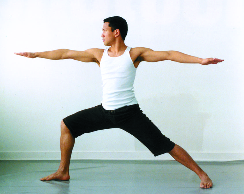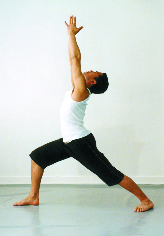 1. Warrior 1 Start by standing with your feet together, then step them apart about 3-4 feet. Turn your right foot out, your left foot in, and your torso to face your right leg. Think of your arms as the sword of the warrior, cutting through discursive thought. Try to find an equal amount of weight on both legs.