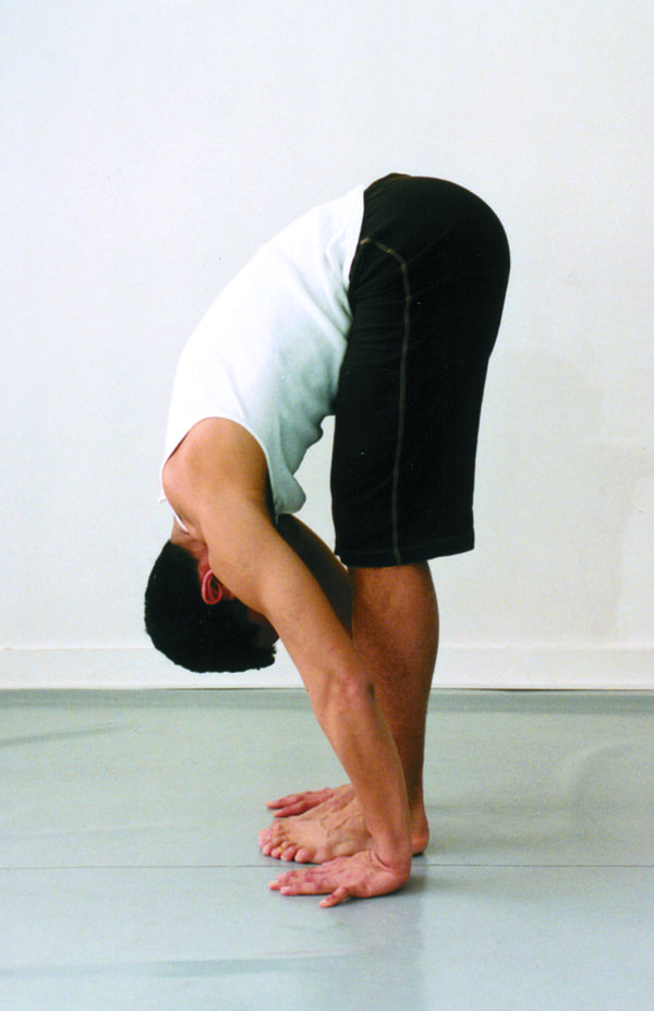 4. Standing Forward Bend Turn your feet back to face front, step them together and fold in half at the waist. If you feel a lot of tightness in your back, or in the back of the neck or legs, then bend your knees. Let your head dangle.