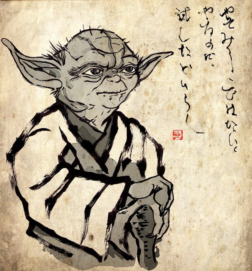An illustrator named Gitoku caught on to Yoda’s monk-like image when he was illustrating old sages and Bodhisattvas. He writes, “I thought, ‘These guys look like Yoda!’” Gitoku put that inspiration into a now-Internet-famous illustration of Yoda in the Zenga style alongside a calligraphy of “No, try not. Do! Or do not! There is no try!”