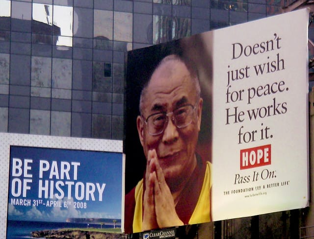 The Dalai Lama peers beneficently down from the billboard beside the freeway. His gentle visage radiates not only his own wisdom but the wisdom of the Buddhas throughout the ages. He is at once a Nobel Peace Prize winner; the leader of the international movement to free Tibet; the human embodiment of Avalokiteshvara, bodhisattva of Compassion, and a symbol of everything that is not greed, unbridled desire, and thoughtless materialism.